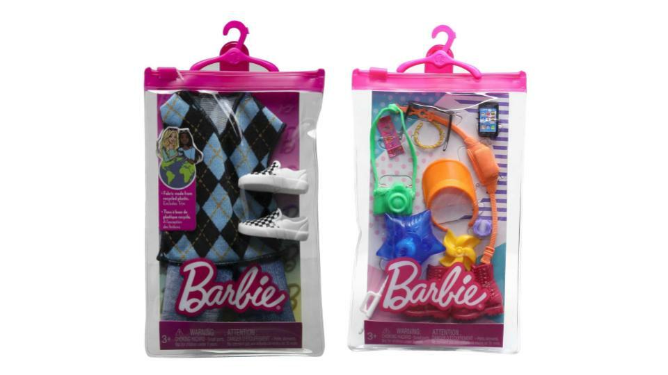 Each fashion pack features one outfit with fabric made from recycled plastic and an accessory to dress Ken doll (doll sold separately).