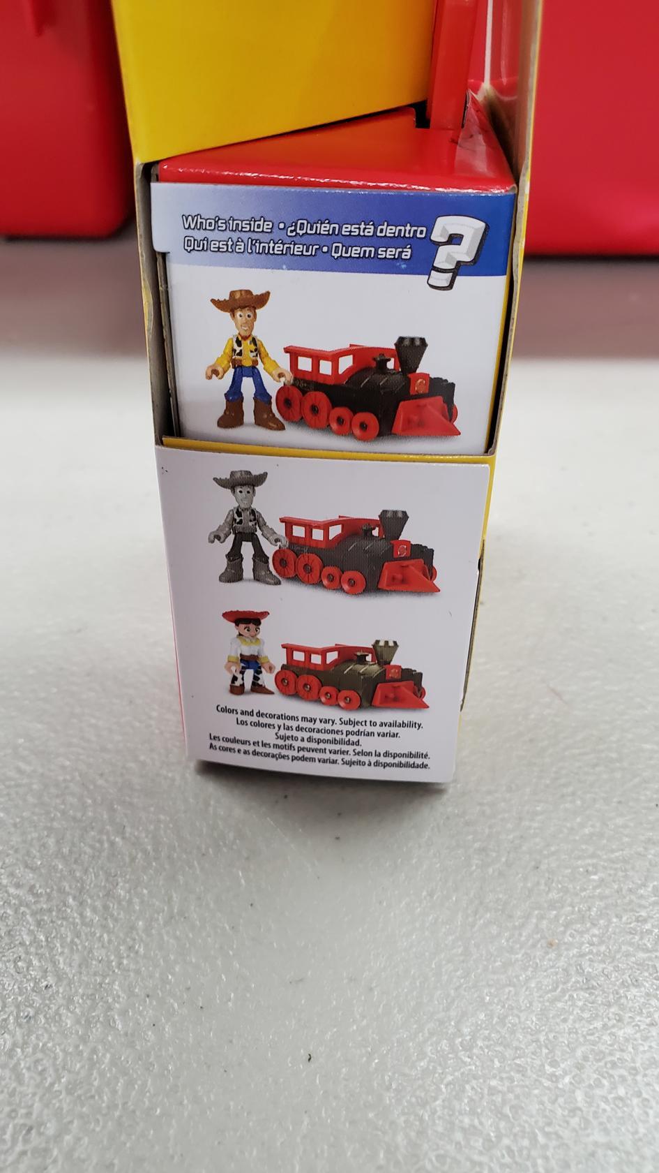 This is a new item that has a surprise reveal of a figure when you flip the package over and hit it on a table or other hard surface it will pop the imaginext figure out of the other side. Then the package that the figure comes out of can be assembled into a small vehicle for the figure.
