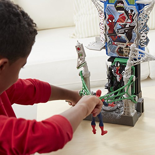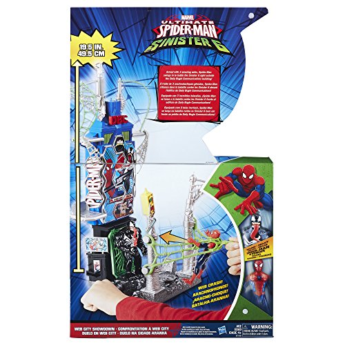 When villains threaten the safety of the city, Spider-Man defends justice and sends bad guys flying with big city, web-shooting action! With the Web City Showdown play set, kids can imagine setting up Spidey to swing into action and take down the bad guys. Kids can set up the web-slinger in a variety of poses and use the included web accessories to launch triple web action – from web nets, to web swinging and web crashing, this play set lets kids imagine tangling up even the smartest of villains. With the included Spider-Man and Venom figures, kids can imagine epic face off battles between the web-slinging rivals in one detailed web city play set! Copyright Marvel. Hasbro and all related terms are trademarks of Hasbro.