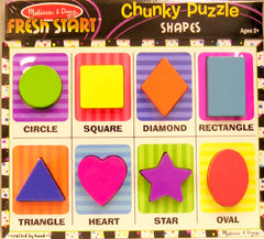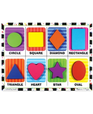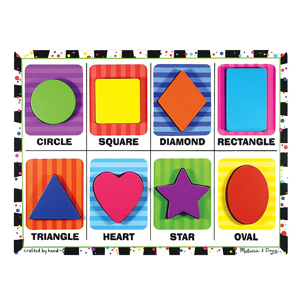 Eight familiar shapes are featured in this extra-thick wooden puzzle with easy-grasp, chunky pieces. Each piece has a matching picture underneath and the shape name is printed on the puzzle board. It all shapes up to a great time with Melissa and Doug.