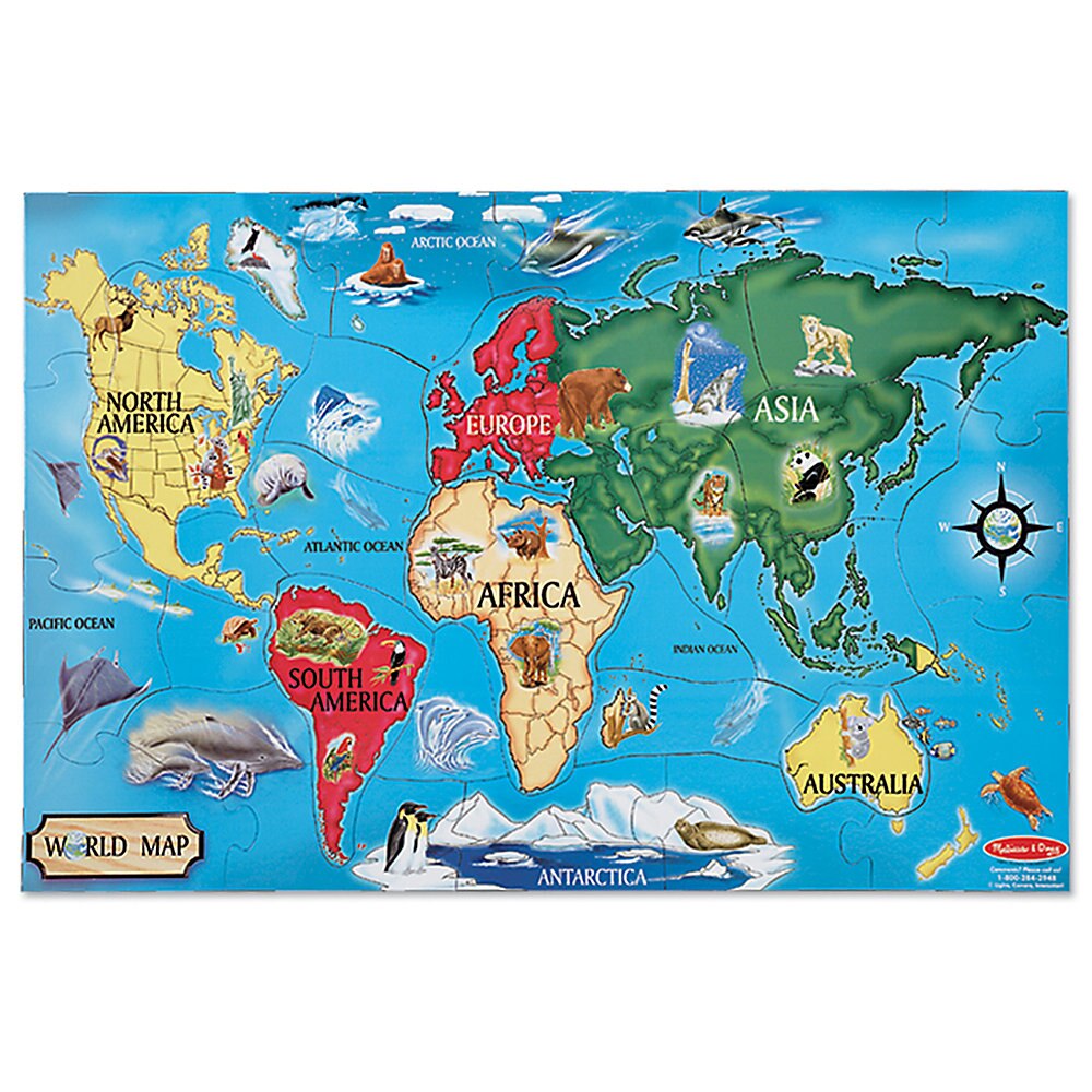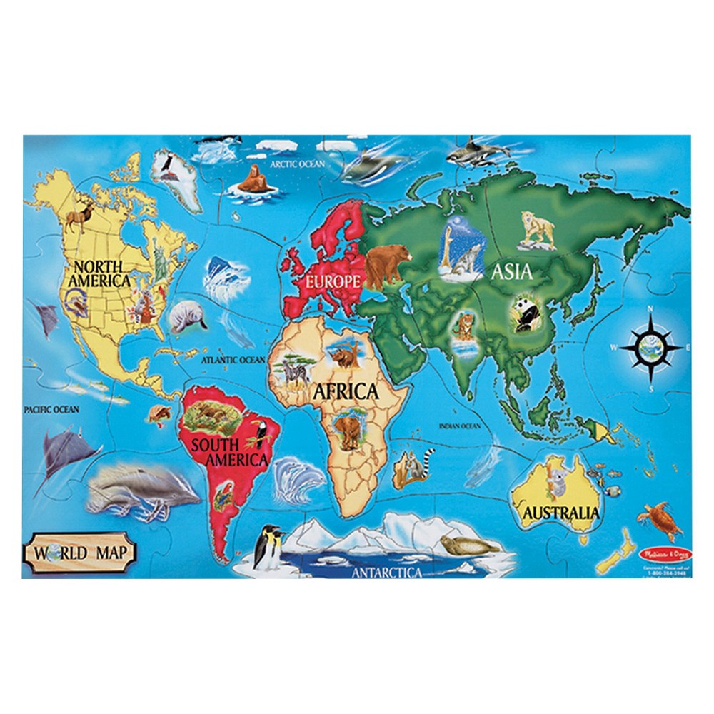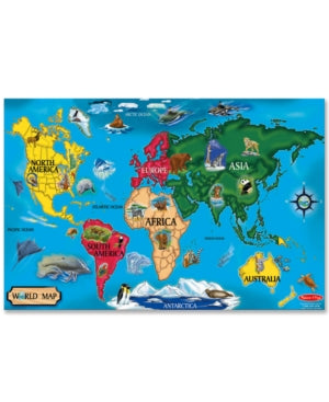 Explore the continents of the world and some of their animal inhabitants. This Melissa and Doug puzzle spans 2' x 3' when assembled, and the 33 extra-thick pieces feature an easy-clean surface to keep them looking like new. It's fun to learn world geography while assembling this detailed map!