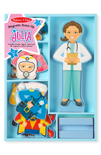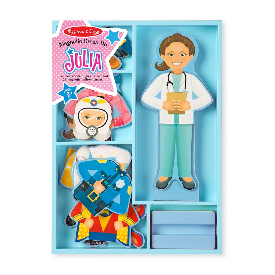 Whatever job Julia decides to take on, she can be dressed for success! Whether she's an astronaut, firefighter, doctor, superhero, artist, rock star, chef, or police officer, she is ready to tackle many tasks at a moment's notice. The set includes a magnetic wooden dress-up figure with a wooden stand and 24 magnetic clothing pieces to create eight occupational uniforms and outfits. The doll, stand, and pieces all store in a sturdy wooden tray. This distinct dress-up doll helps kids three and older develop hand-eye coordination and fine motor, counting, and sorting skills and encourages creative expression and imaginative play. This magnetic dress-up set includes plenty of clothing and accessories that can be mixed and matched between each other to create different occupational looks. The Melissa and Doug Julia Magnetic Dress-Up Set is an exceptional gift for kids ages 3 years and up. Add the Melissa and Doug Abby and Emma play set to round out the pretend play and screen-free play experience. For more than 3