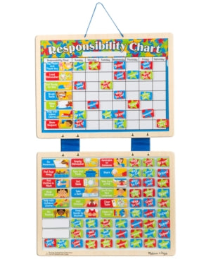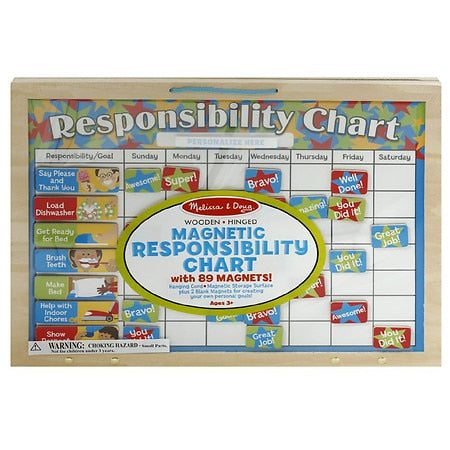 Catch children in the act of behaving well and reward them, then watch those good habits multiply! Open the fabric-hinged boards to reveal a behavior chart on one board, while the other board keeps all the magnets close at hand. A sturdy cord is attached for hanging the chart. The set includes a dry-erase board and 90 magnets, featuring responsibilities, positive behaviors, and rewards. This kids’ responsibility chart has been designed to help kids develop strong responsibility traits and encourage good behavior. Parents can discuss with kids what responsibility means and why it’s important. They can also share what some of their own responsibilities are, then talk about what kinds of behaviors and responsibilities are expected of their kids. Use the magnets provided to talk about specific tasks and behaviors. The Melissa and Doug Magnetic Responsibility Chart makes an exceptional gift for kids 3 years and up. Add the Melissa and Doug My First Daily Calendar to round out the hands-on, screen-free play ex