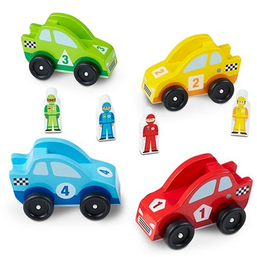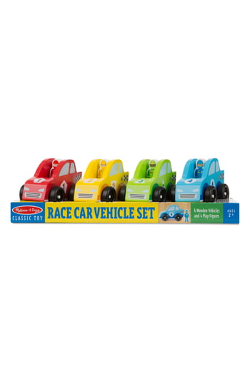 Melissa & Doug Race Car Wooden Vehicle Set:Set of 4 sturdy wooden 5" race car vehiclesIncludes red, yellow, green and blue race cars and 4 play figuresPlay figures have images on both sides and fit into the driver seats and can also stand independentlyEncourages hand-eye coordination and fine motor skillsPromotes imaginative playAges 2+