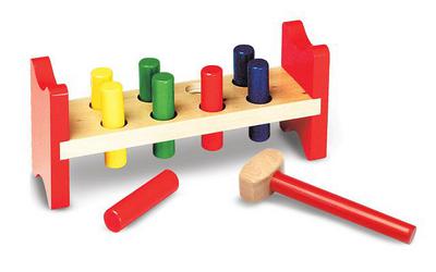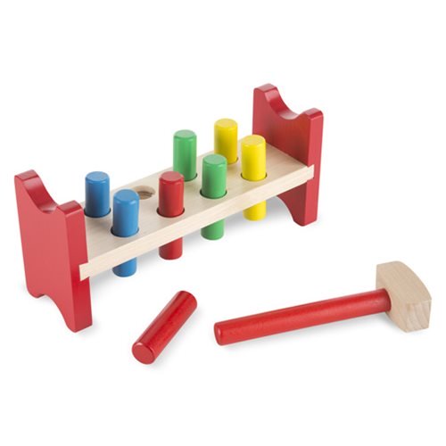 Pound the eight colorful wooden pegs into the wooden frame, then flip it over to repeat the activity again and again included are a wooden hammer and four pairs of pegsgreat for color matching.