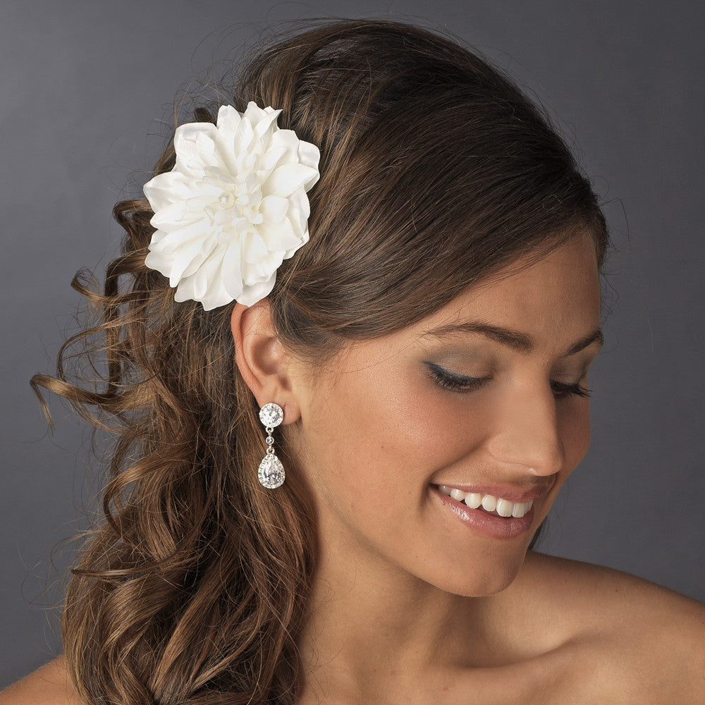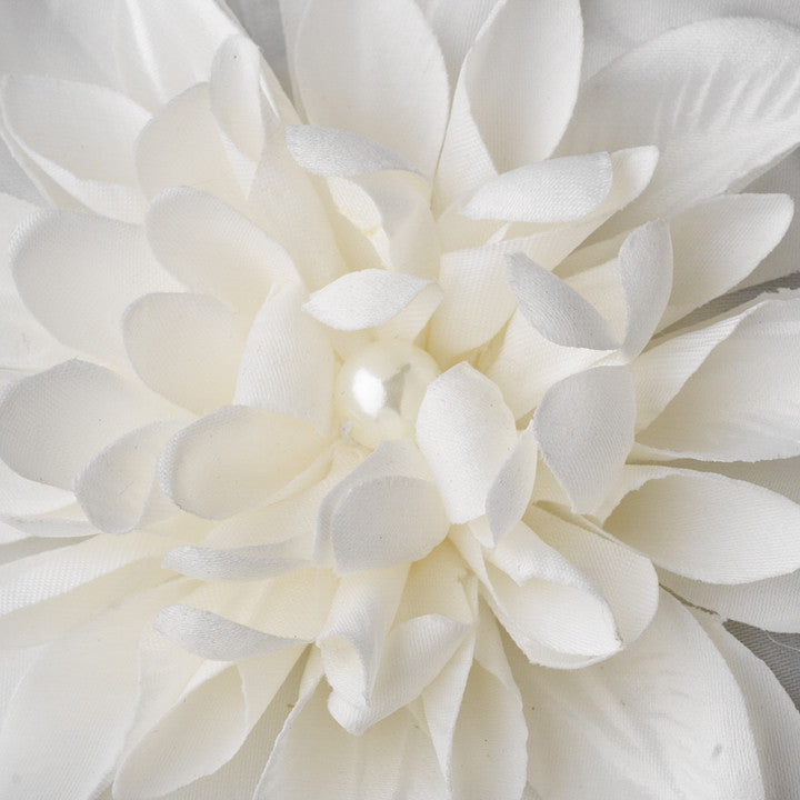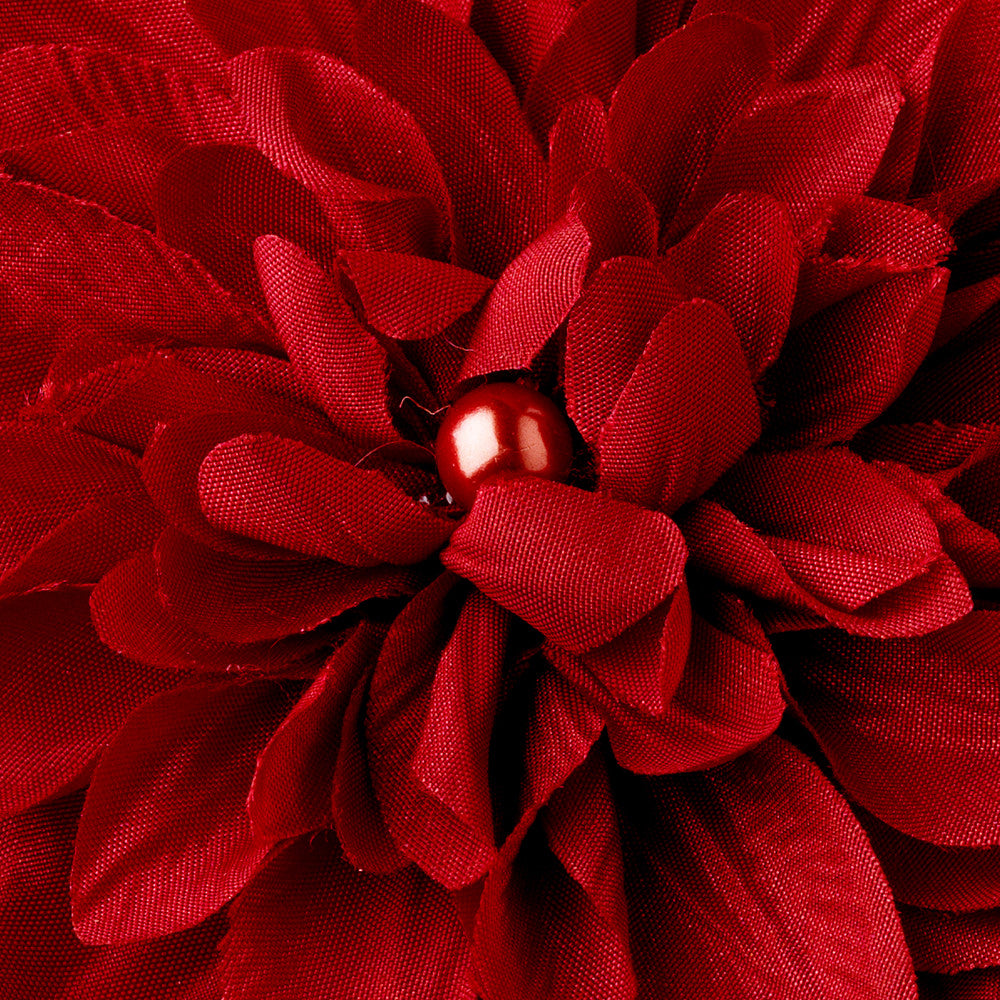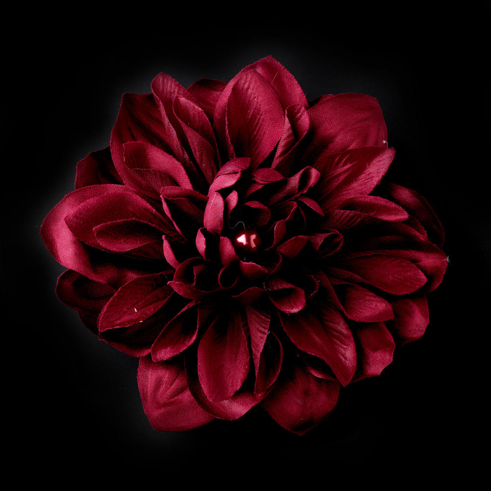 This floral hair accessory features a Dahlia-inspired floral design in a ivory, maroon or red color. In the center of the piece is accented with a center faux pearl. The piece attaches to your hair with an alligator clip. Perfect accessory to any ivory wedding dress, or to add a little punch of couture style to an everyday outfit. The piece measures with a radius of 4".