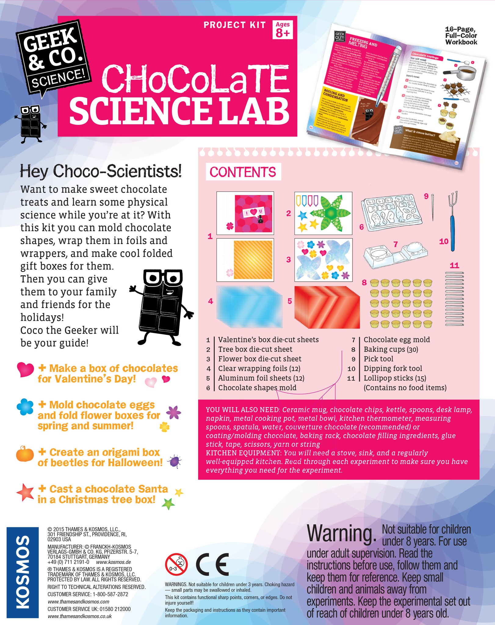 Explore physical science while you make cute chocolate gifts to give to your friends and family! Learn about heat, temperature, and the phases of matter by molding chocolate eggs, lollipops, and other shapes. Finish your personalized gifts with wrappers, labels, and foldable gift boxes.  - See more at: http://www.thamesandkosmos.com/index.php/geekandcoscience/chocolate-science-lab-#sthash.Jlxl8n35.dpuf