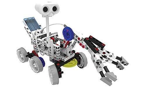 Ready your courageous robots for a mission to the moon, Mars, or beyond! With this engineering kit, you can build a remote-controlled model of a robotic Rover resembling the ones used to explore Mars. Deploy your Mars rover in the backyard or sandbox and use the remote control unit to survey the uncharted terrain! The remote can control up to three motors, which move the Rover back and forth, turn the wheels to steer the Rover, and control the robotic arm to pick up extraterrestrial specimens like small rocks. This one-piece construction set includes instructions to build not only the robot Rover, but nine additional space-themed models as well, including: a lunar Rover, rocket launcher car, space shuttle with opening and closing cargo bay doors, robotic space shuttle payload arm, moon lander, wacky Astronaut, satellite, Mars station, and cross-wing flyer. Kids will be inspired to learn various STEM skills through these fun, hands-on construction projects that bridge two captivating interest areas: robots and outer space. A full-color, 64-page step-by-step illustrated manual helps kids assemble all of the models and teaches them about real-world examples of the outer space robots, vehicles and devices They are creating. Read about the various technical features of the Mars curiosity Rover. Learn about the history of Mars exploration, robotics in satellites, deep-space exploration, and the robots in popular space-related science fiction. This kit is perfect for every kid who is fascinated by the prospects of being an astronaut, colonizing the Moon, or being the first human to land on Mars. - a parents' Choice Gold award winner.